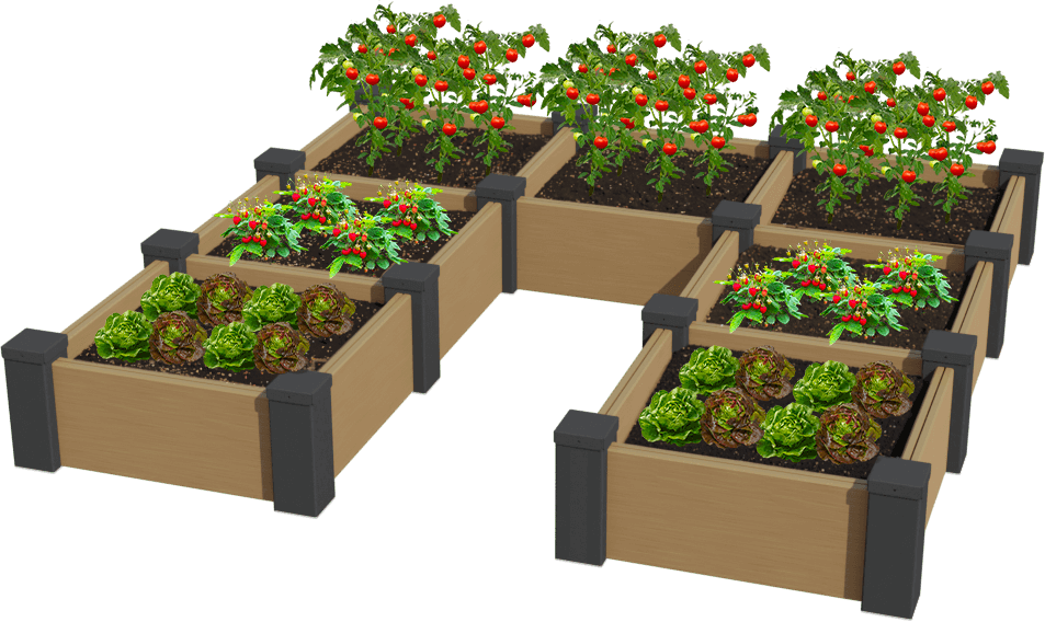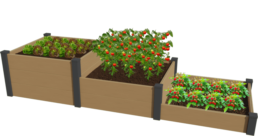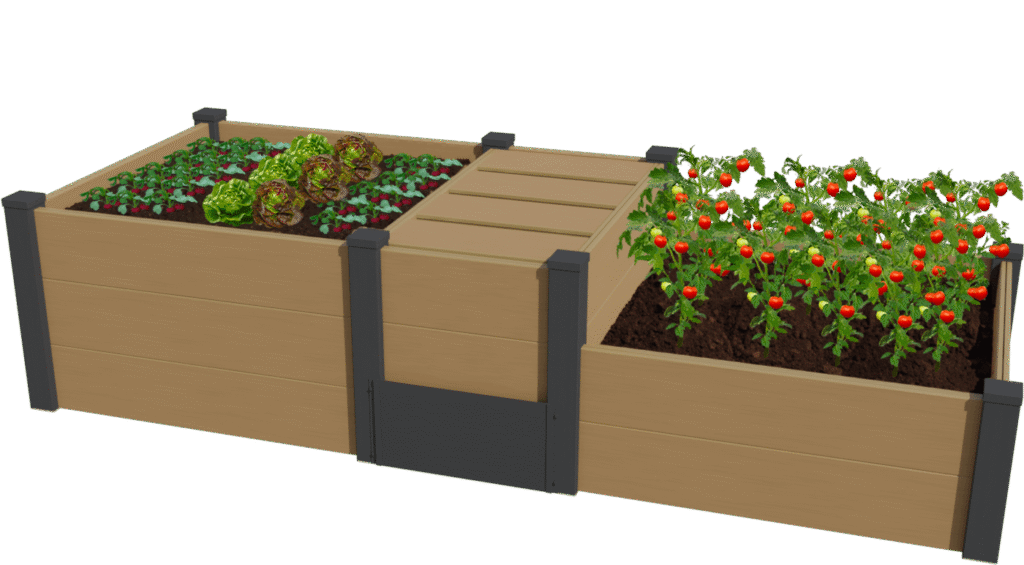 Ce petit carré potager en forme de T, composé de lames composites aux coloris sable et cendre, est l’incarnation de la praticité et du style.